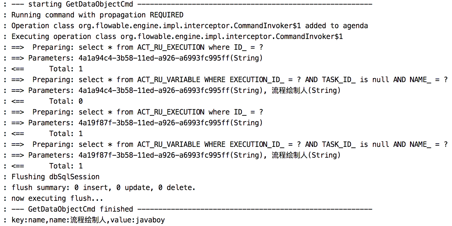 可以看到,这里先去 ACT_RU_EXECUTION 表中查询执行实例 ID,然后再根据拿到的执行实例 ID 去 ACT_RU_VARIABLE 表中查询 dataObject 信息。