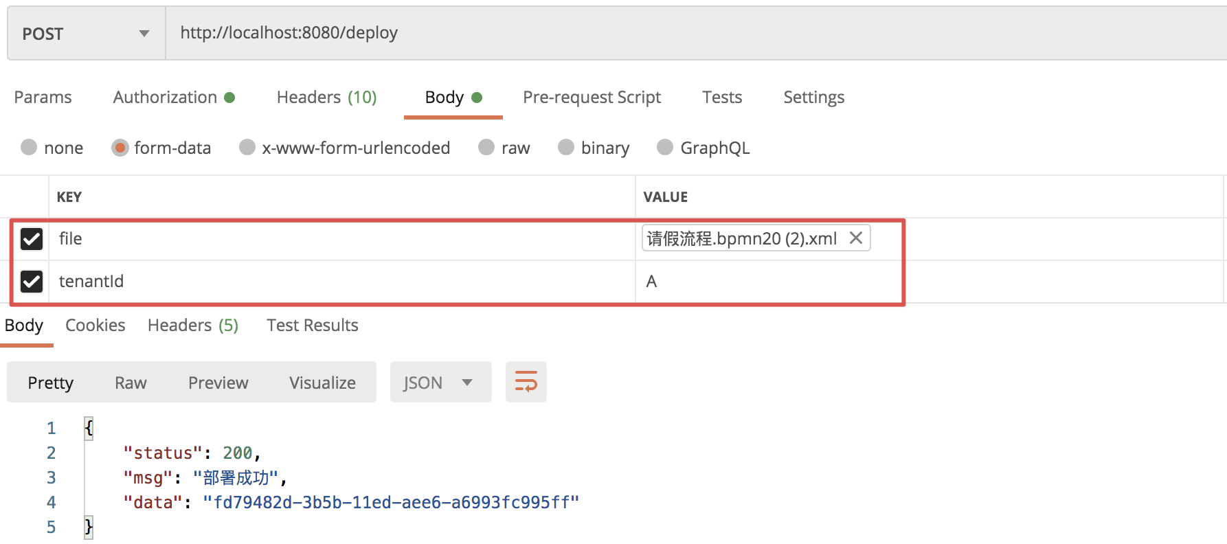 接下来我们通过 POSTMAN 来发送一个 POST 请求,提交流程图和租户 ID 这两个参数,如下图: