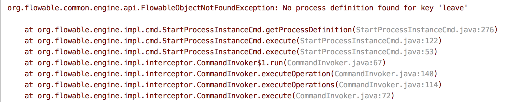 接下来我们需要启动流程实例的时候,就不能单纯拿着流程部署的 ID 去启动了,还得拿上流程的租户 ID。如果只拿流程本身的信息去启动,会抛出如下异常: