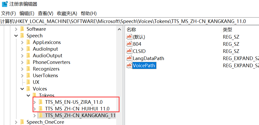 其中Kangkang就是男声音,但是在注册表里边,这个Kangkang是没有加载进去的,默认就只加载了Huihui和Zira两个女声。