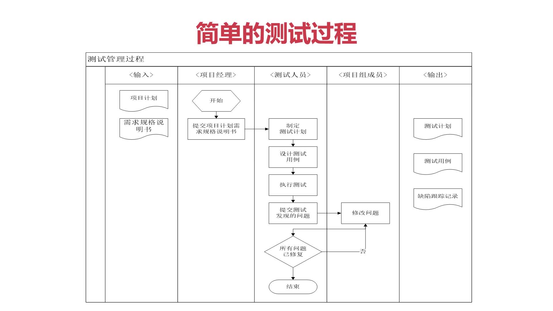 <输出>–测试计划,测试用例,缺陷跟踪记录。