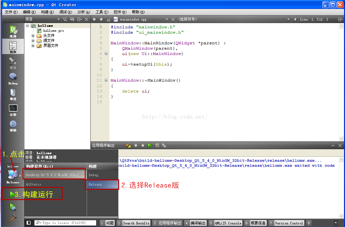 它的项目生成目录是 C:\QtPros\build-hellomw-Desktop_Qt_5_4_0_MinGW_32bit-Release\ 。