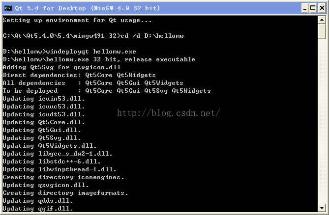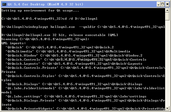 然后使用 windeployqt 工具命令:windeployqt helloqml.exe --qmldir C:\Qt\Qt5.4.0\5.4\mingw491_32\qml
