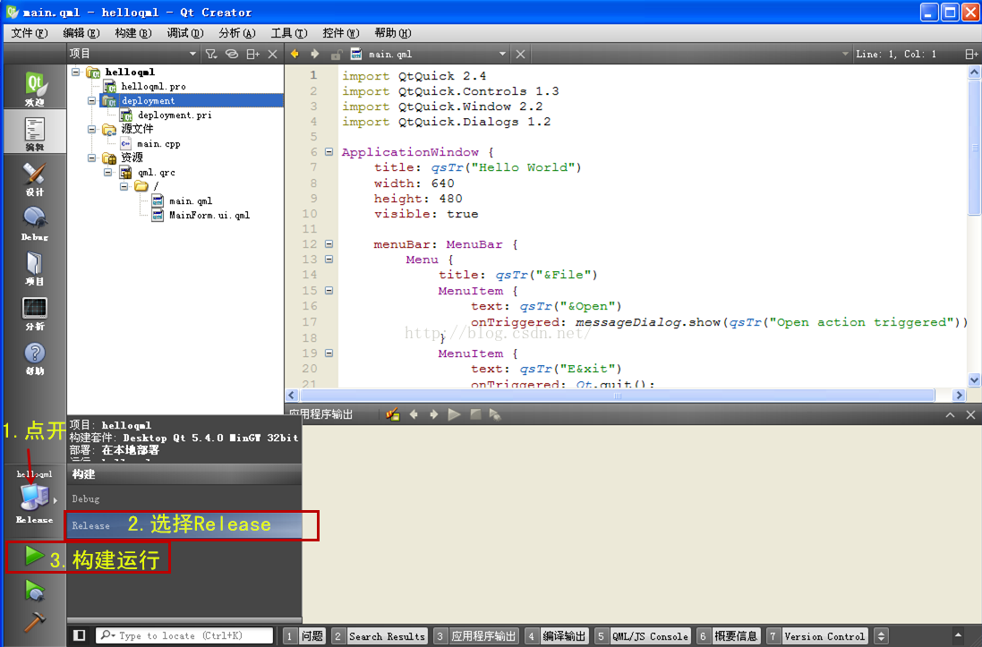 它的构建目录是:C:\QtPros\build-helloqml-Desktop_Qt_5_4_0_MinGW_32bit-Release\ 。