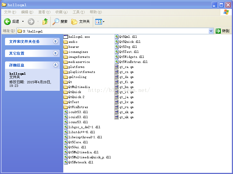 进入这个目录,再进入 release 子文件夹,找到 helloqml.exe ,复制到一个新的单独的文件夹里面,比如 D:\helloqml\ 文件夹里面。