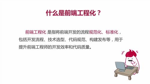 前端工程化是指将前端开发的流程规范化、标准化、包括开发流程、技术选型、代码规范、构建发布等、用于提升前端工程师的开发效率和代码质量