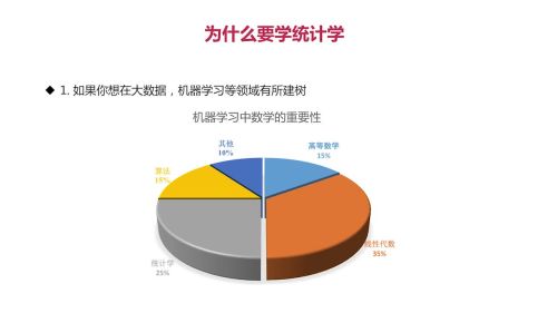 甚至统计学和数学在机器学习中的重要性,但一直没有系统学习过统计学,这个会通过案例分享来具体讲解,很期待。(今天工作中遇到了统计学名词,感到很吃力,因此学习学习)