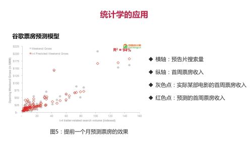 以谷歌票房预测模型为例,谷歌根据电影搜索量,预告片点击量等等方面来预测票房。预测模型准确率最终达到94%。使用的是线性回归模型。