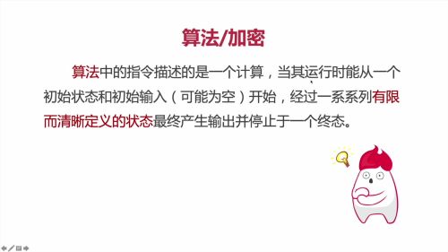 算法中的指令描述的是一个计算,当其运行时能从一个初始状态和初始输入(可能为空)开始,经过一系系列有限而清晰定义的状态最终产生输出并停止于一个终态。