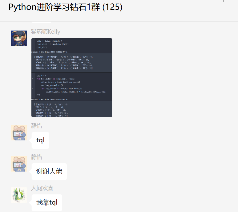 最后感谢粉丝【静惜】提问,感谢【心田有垢生荒草】、【猫药师Kelly】、【人间欢喜】给出的思路和代码解析,感谢【dcpeng】等人参与学习交流。