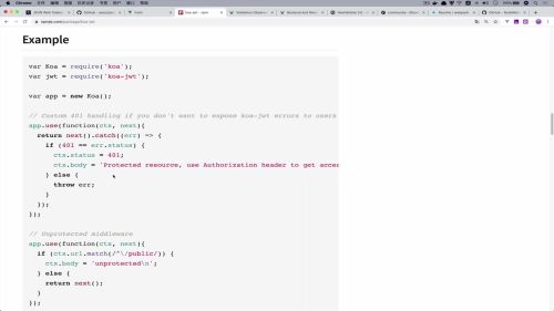 学习到了怎样使用kow-jwt实现鉴权,首先npm安装,在package.json 中导入app.use(jwt({ secret: ‘shared-secret’ })); JWT(JSON Web Tokens) 是一种方便地实现服务器与客户端安全通讯的解决方案,分为三个部分:Header、Payload、Signature,浏览器发送请求时将 token 带到服务器