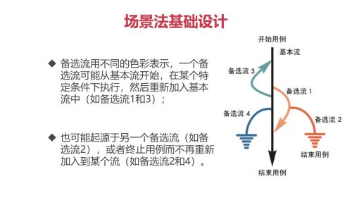 备选流用不同的色彩表示,一个备选流可能从基本流开始,在某个特定条件下执行,然后重新加入流程中(如备选流1和3)