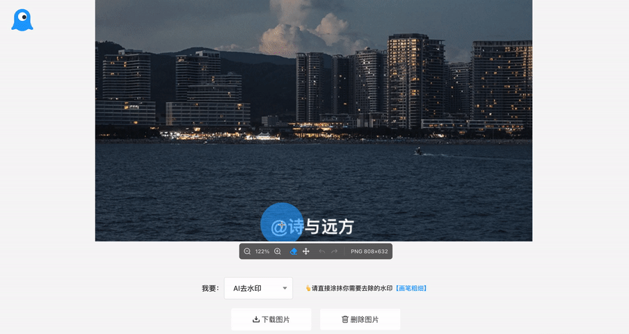 只需要上传图片后,用涂抹笔涂抹水印位置,点击开始就能去除水印了。