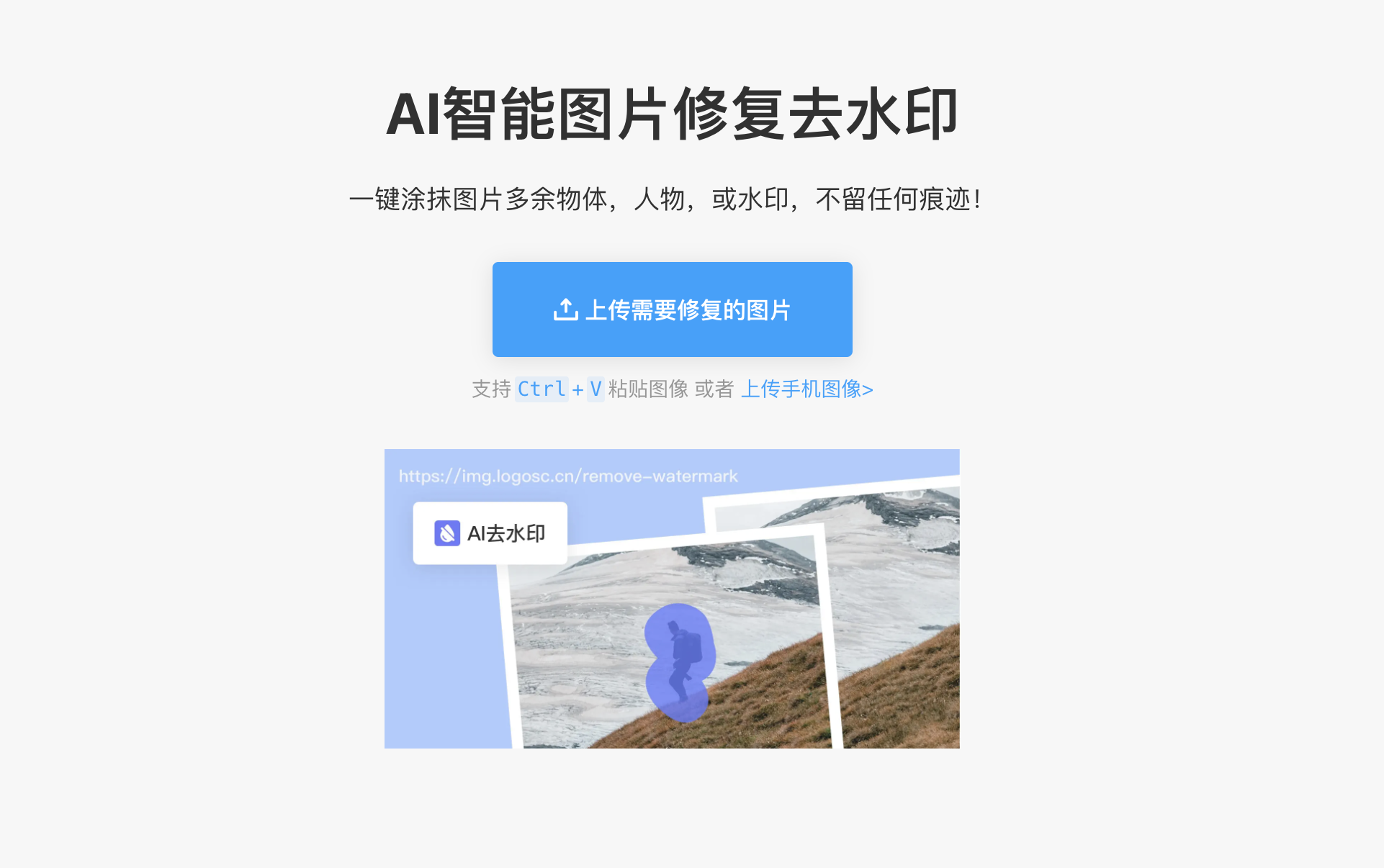 首先给大家推荐一个工具改图神器,其中的AI智能图片修复去水印功能可以完美去除照片上的水印文字,操作也非常简单,只需要上传图片到网页中,用画笔涂抹水印部分,点击「去除水印」就可以完成啦!