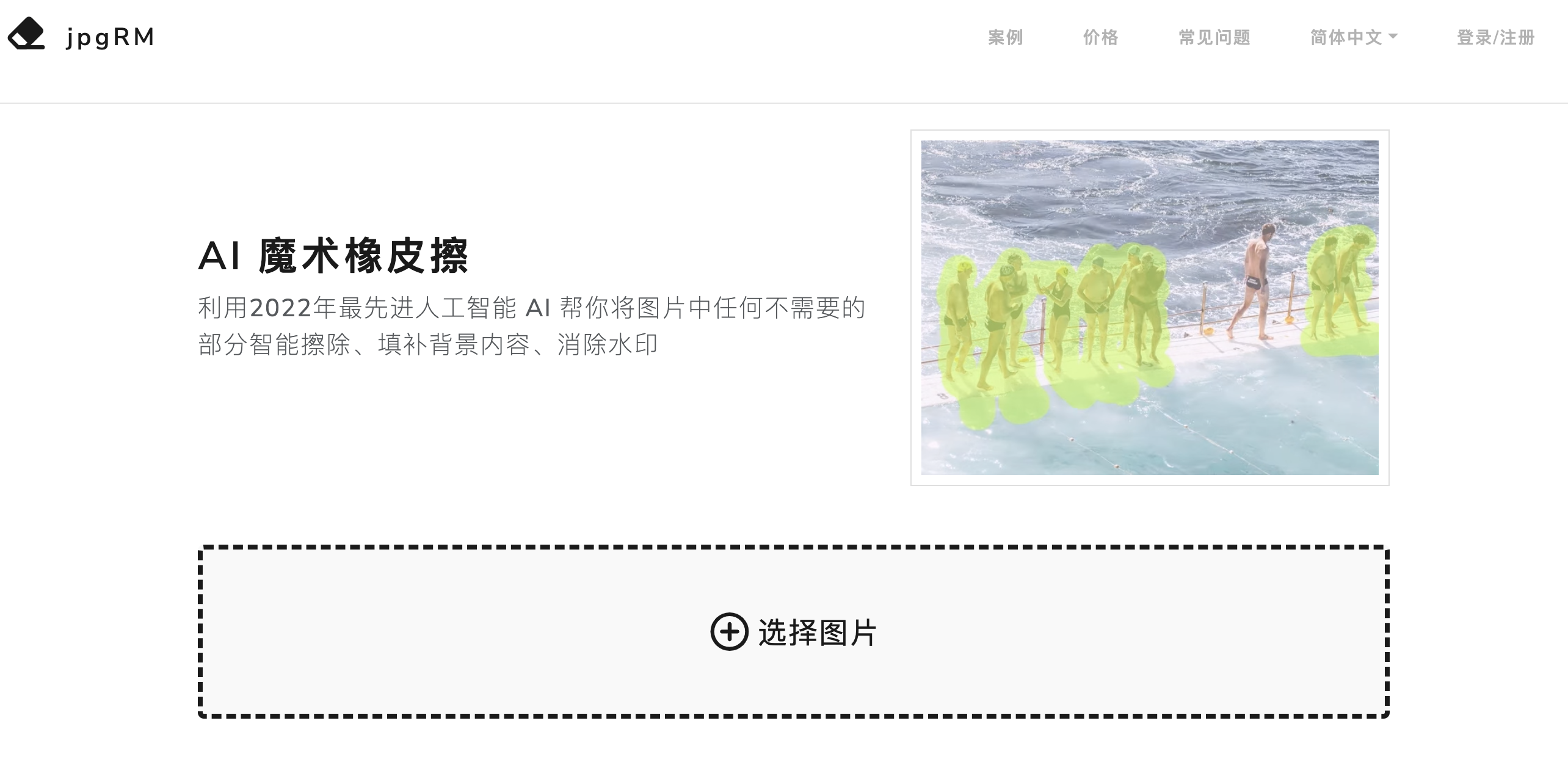 再给大家推荐一个无痕去水印工具jpgRM,jpgRM的AI魔术橡皮擦功能利用2022年最先进人工智能 AI 帮你将图片中任何不需要的部分智能擦除、填补背景内容、消除水印,帮助你轻松去除不想要的水印和其他图片中的元素。