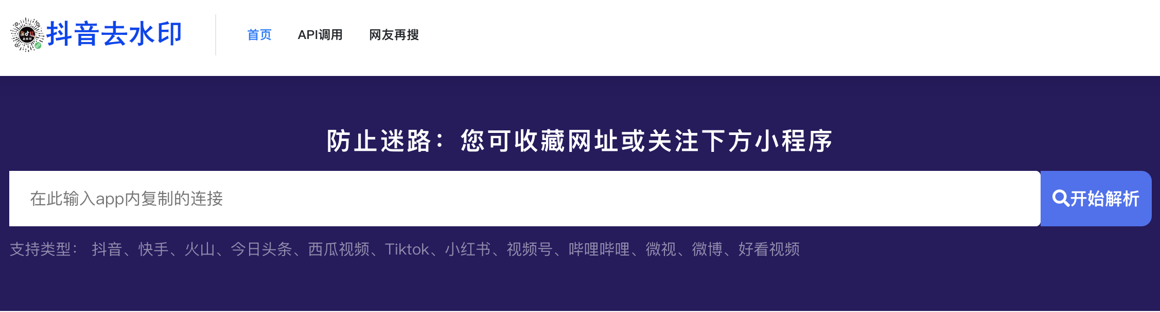 除了下载好视频去除水印外,还可以选择解码工具直接下载无水印视频,在这里推荐一个超好用的在线解码工具「抖音去水印」,并且除了抖音外,它还支持解码快手、火山、今日头条、西瓜视频、Tiktok、小红书、视频号、哔哩哔哩、微视、微博、好看视频等等网站的视频。
