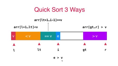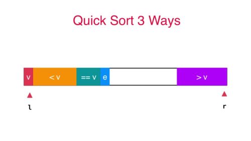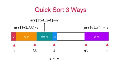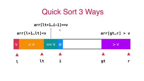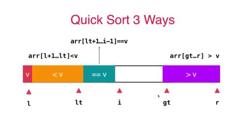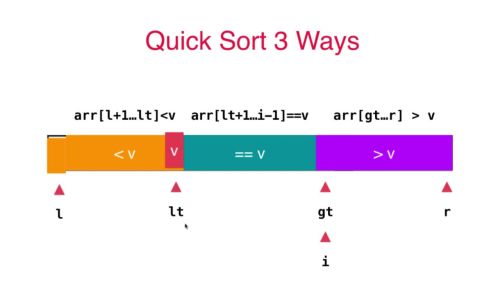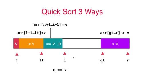三路快速排序将数组分成了 <V, ==V, >V 三部分,这样只需递归的对<V和>V的部分进行快速排序