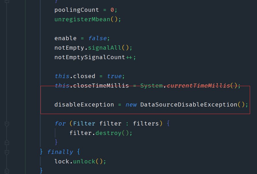 他这个case在进行连接切换后,会对老的数据源进行连接清理。他里面的用数据源是HikariDataSource,如果你用apollo提供的case,当你是使用druid数据源时,我贴下druid的关闭部分源码