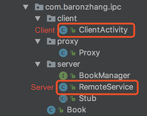 一次跨进程通信必然会涉及到两个进程,在这个例子中 RemoteService 作为服务端进程,提供服务;ClientActivity 作为客户端进程,使用 RemoteService 提供的服务。如下图: