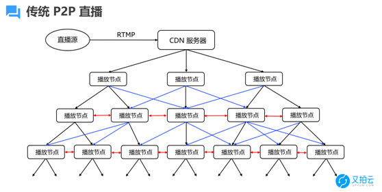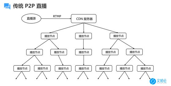 树状和网状 P2P 网络有两个共同特点,其中一个就是延时大,数据进来之后要经过好多中转才能到最后的播放节点。