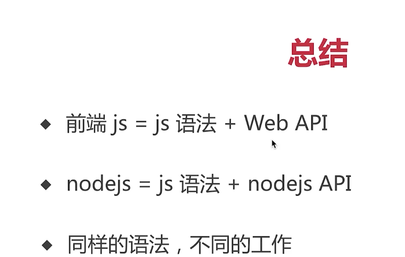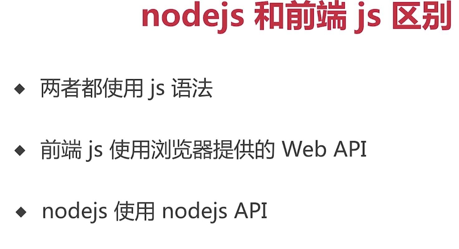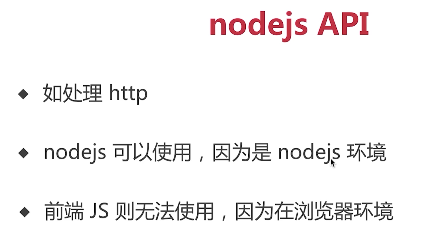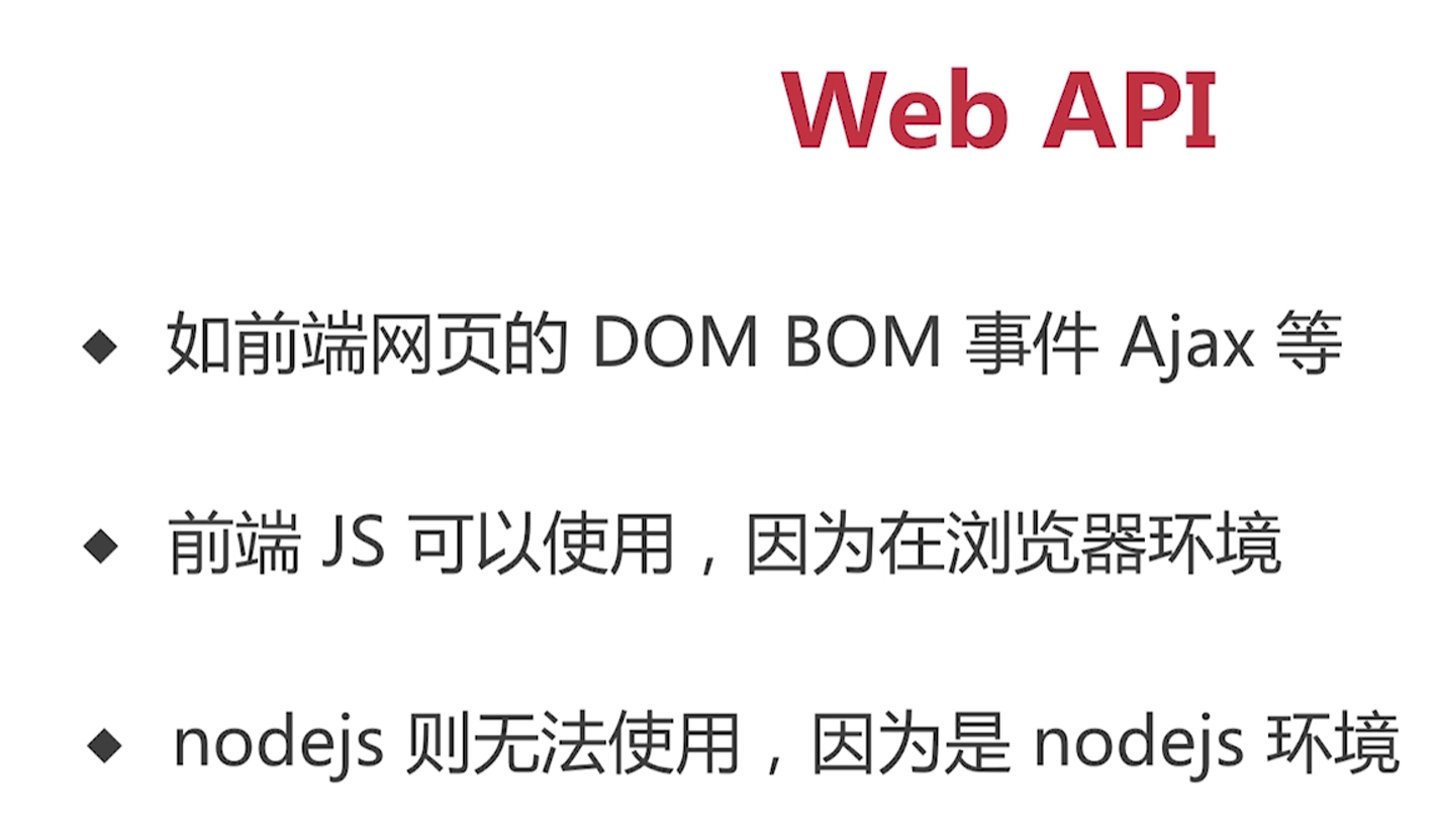 前端的一些浏览器环境的API,我们叫做Web API,这些在 nodejs 中是没法使用的,因为它是nodejs环境。