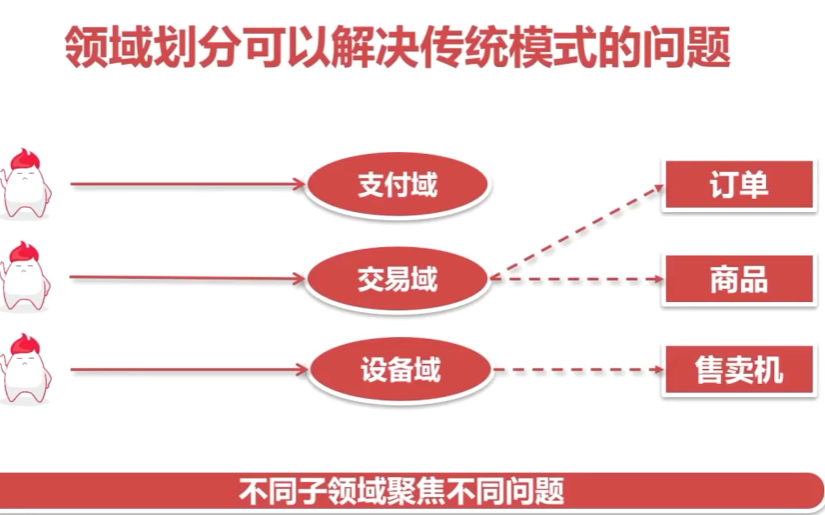 领域划分:问题的划分,以关注点为原则对问题进行拆分,粒度是该关注点所有问题都在这个区域内,就是一个子域。