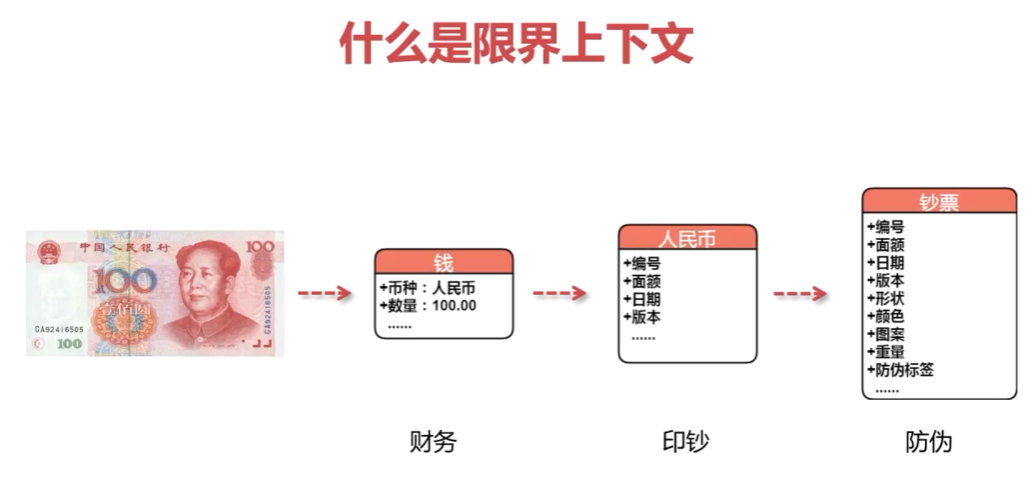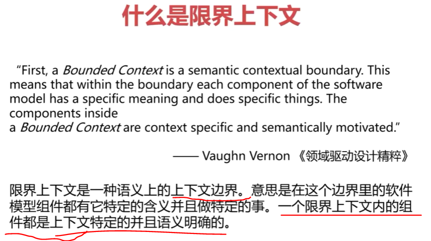 界限上下文:在不同的场景下,同一个名词有不同的含义,如果想让同一个事物在不同的场景下有相同的含义,就需要需要约束限界上下文。这就是线性上下文的作用和含义