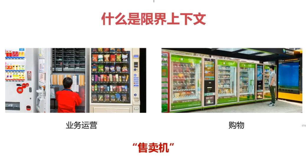 例子2:售卖机,在运营人员眼里,这是一个需要不断补充商品的货架。在用户的眼里,这是一个能够购买上面的货架。用户和运营人员在各自的领域内,或者上下文内,对同一个事物理解是不一样的。如果想要一个确定唯一的含义,就需要确定它的限界上下文。