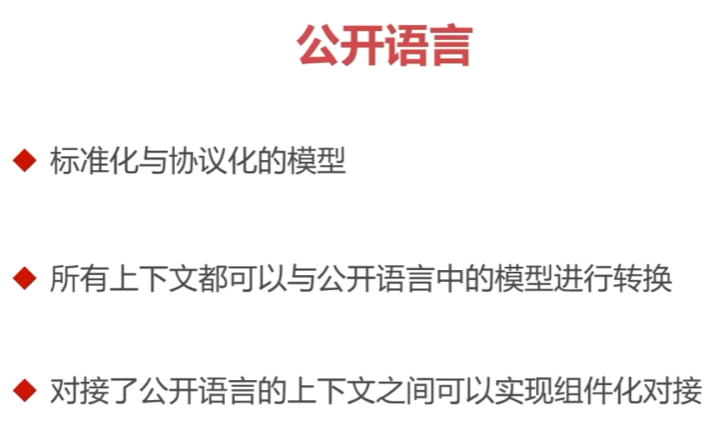 8,公开语言:标准化或协议化模型,自己的上下文可以转换成协议模型,协议模型可以转回成自己的模型。(就是固定对象,上下游都不需要改动,直接用的对象)