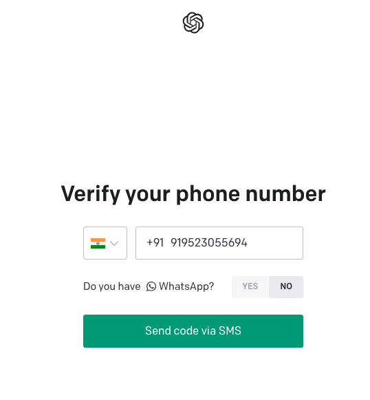 随后复制电话号码并粘贴到 “第 1 节 注册 OpenAI 账号” 的地方,点击 “Send code via SMS” 发送验证码。
