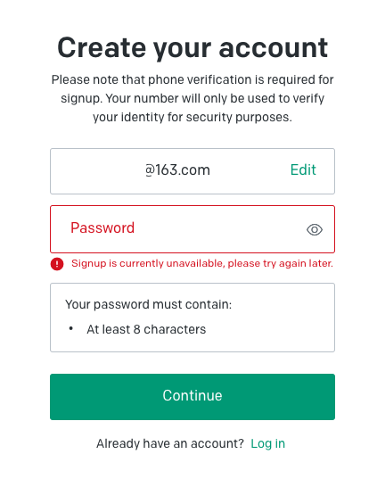 - Signup is currently unavailable, please try again later: 不要使用 163 邮箱,目前还可以使用 QQ 邮箱,最好使用 Google / Microsoft 账号。