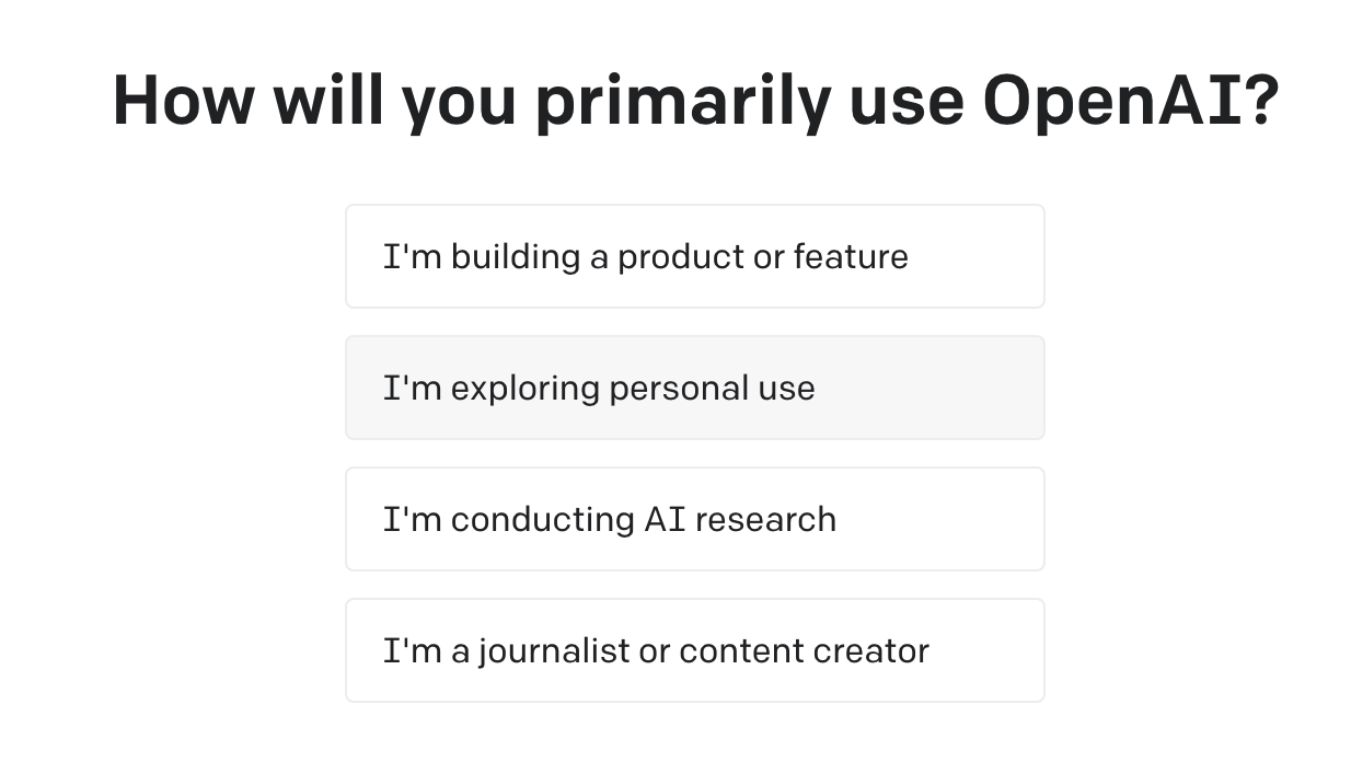 注册成功后,页面会要求选择使用 OpenAI 的主要原因,随意选择。