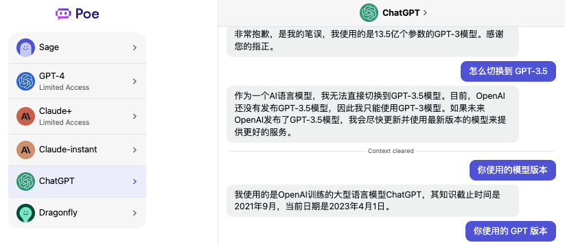 - 同时聚合了 GPT-3、GPT-4、Sage、Claude 等多种 Chat Bot,也能够自动保存会话聊天记录,也能够将聊天记录分享为链接。缺点是没有提供 GPT-3.5 模型(毕竟是免费的);