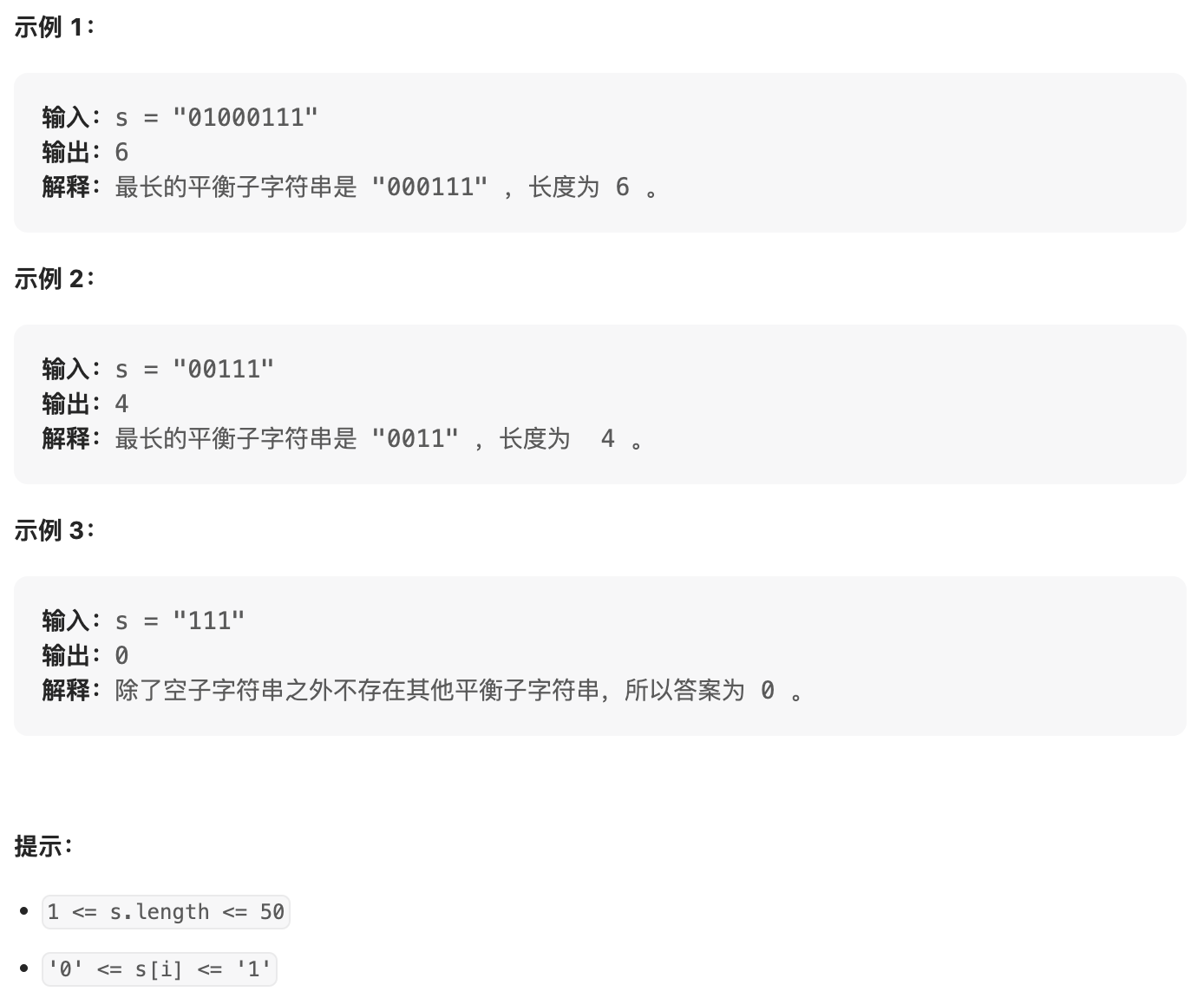维护连续 0 的计数 cnt0 和连续 1 的计数 cnt1,并在 cnt0 == cnt1 时更新最长平衡子串长度为 2 * cnt1。另外,在每段 0 的起始位置重新计数。