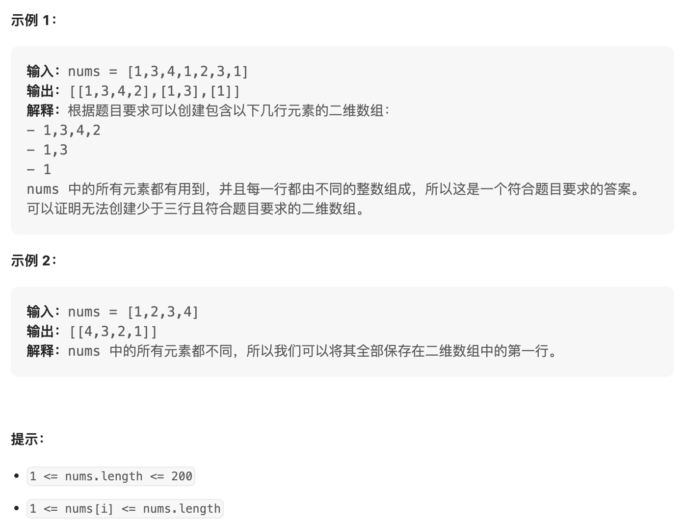 给你一个整数数组 nums 。请你创建一个满足以下条件的二维数组: