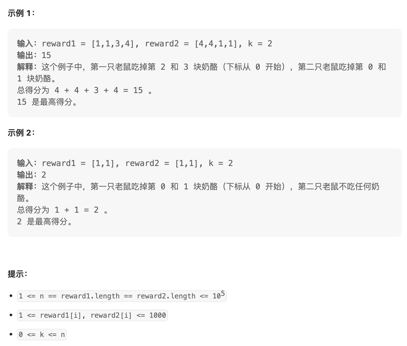 reward1[i]。 - 如果第二只老鼠吃掉,则得分为