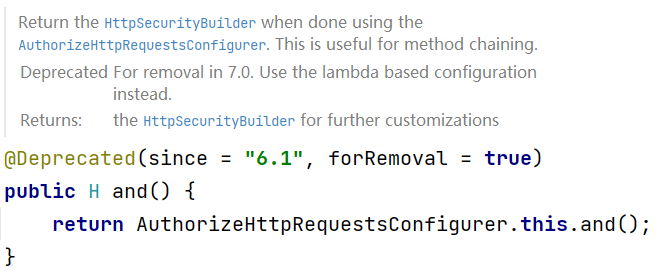 包括大家熟悉的用来连接各个配置项的 and() 方法现在也废弃了,并且按照官方的说法,将在 Spring Security7 中彻底移除该方法。