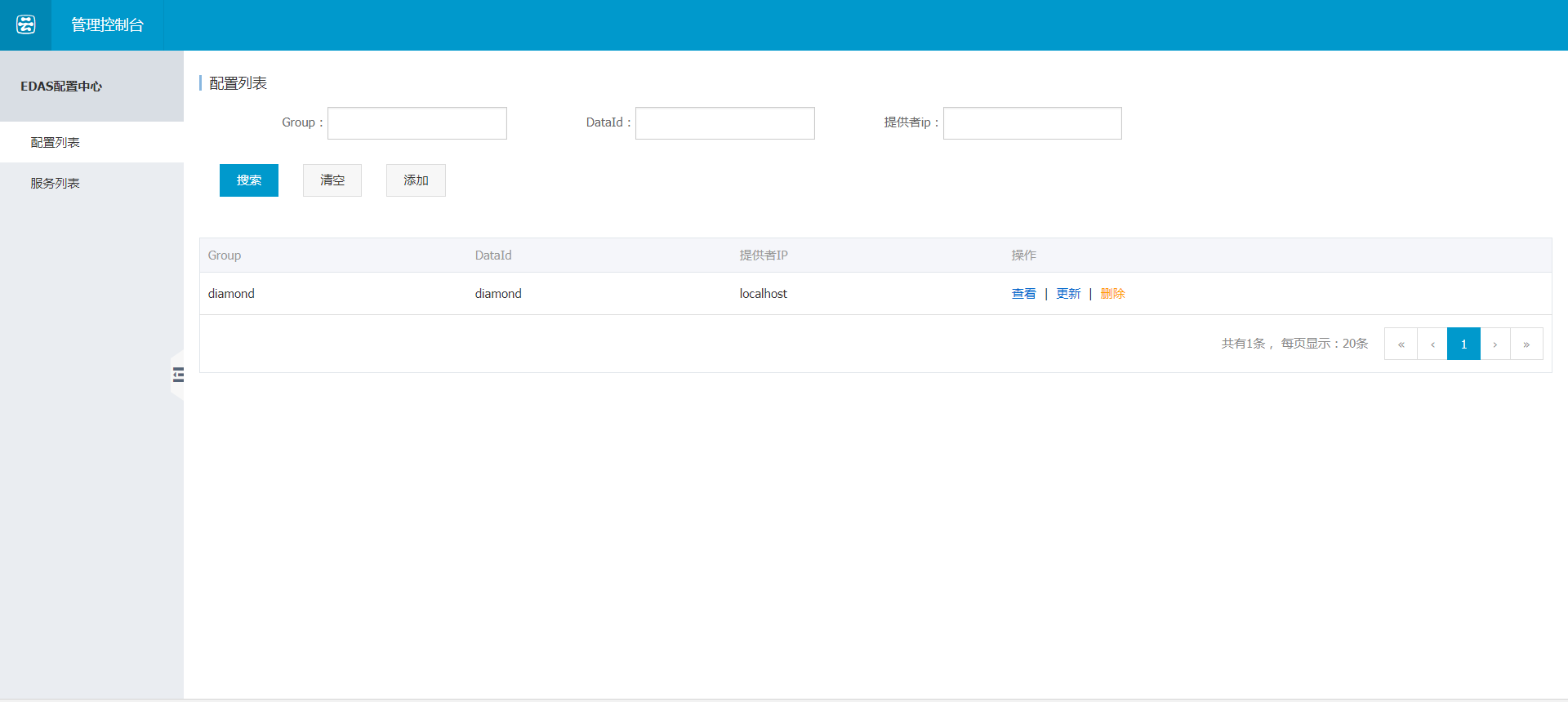 另外,EDAS的轻量版配置中心启动以后,不光内嵌了一个简单的开发版服务注册中心,还包含了一个简单的分布式配置服务,以下这个页面可以进行配置的维护操作。