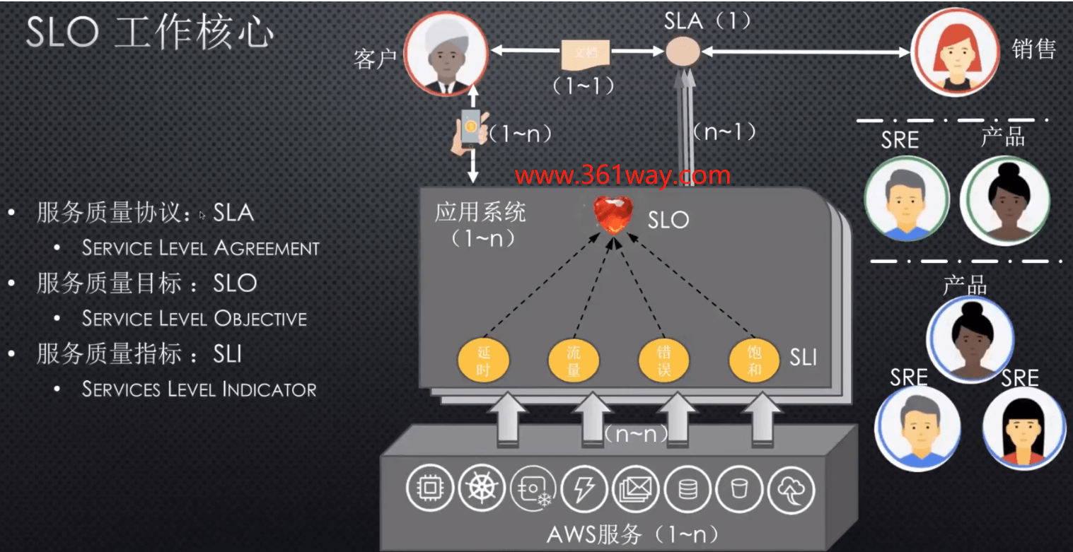 服务质量指标(SLI):服务的某项服务质量的一个具体量化指标。常见的SLI包括请求延迟(处理请求所消耗的时)、错误率(请求处理失败的百分比)、系统吞吐量(每秒请求数量)、可用性(服务可用时间的百分比,运维行业经常用9的数量来描述可用程度。例如,99%可用性被称为“2个9”,99.999%被称为“5个9”)。SLI也可以是一些业务指标,例如用户投诉率之类的。重点是可量化、可确定的。