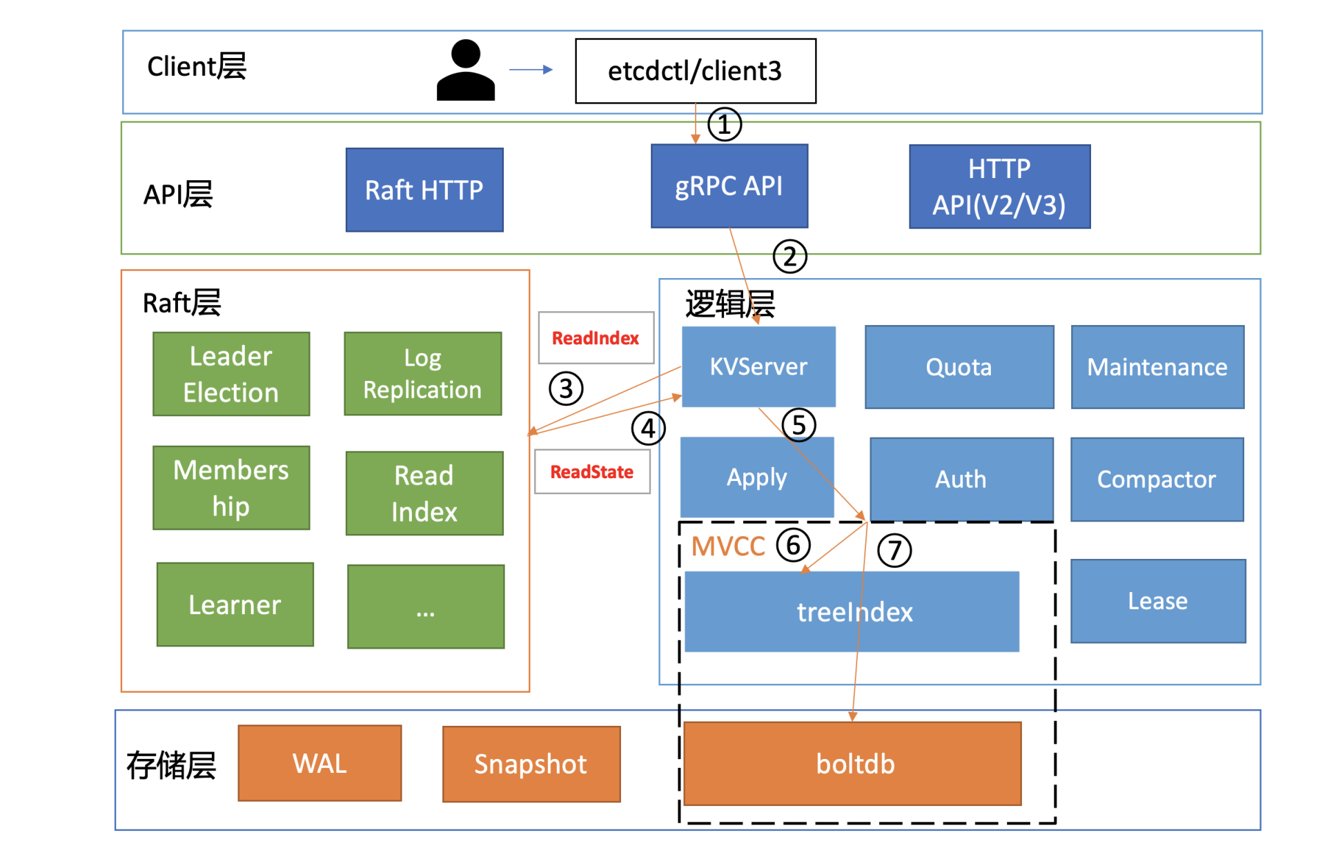 KV 存储查询:Leader 节点从内部 MVCC(多版本并发控制)模块中的 boltdb 数据库中检索对应键的最新有效版本数据。