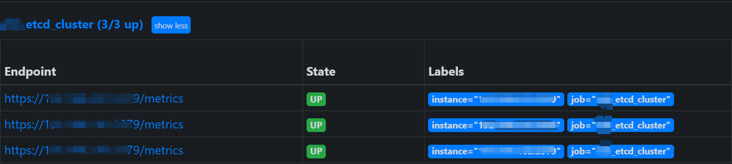 - targets: ['<etcd-node-1>:2379', '<etcd-node-2>:2379', '<etcd-node-3>:2379']