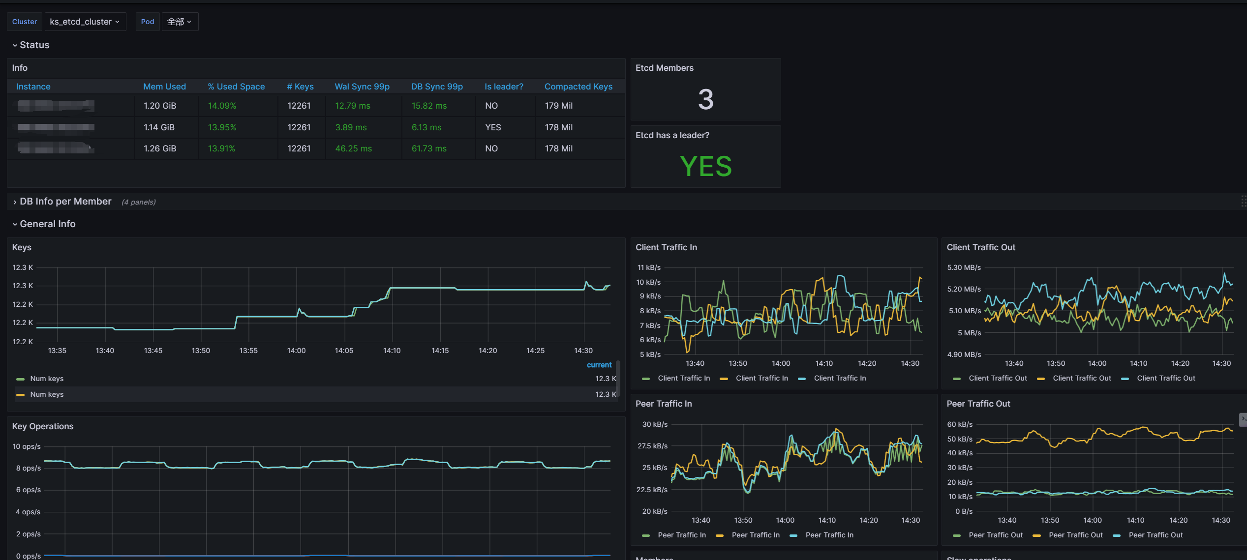 最后,为了提升运维效率和问题定位能力,可以基于收集到的 metrics,在 Grafana 中创建可视化面板,展示集群 Leader 状态、key 总数、watcher 数、出流量以及 WAL 持久化延时等关键运行状态指标。