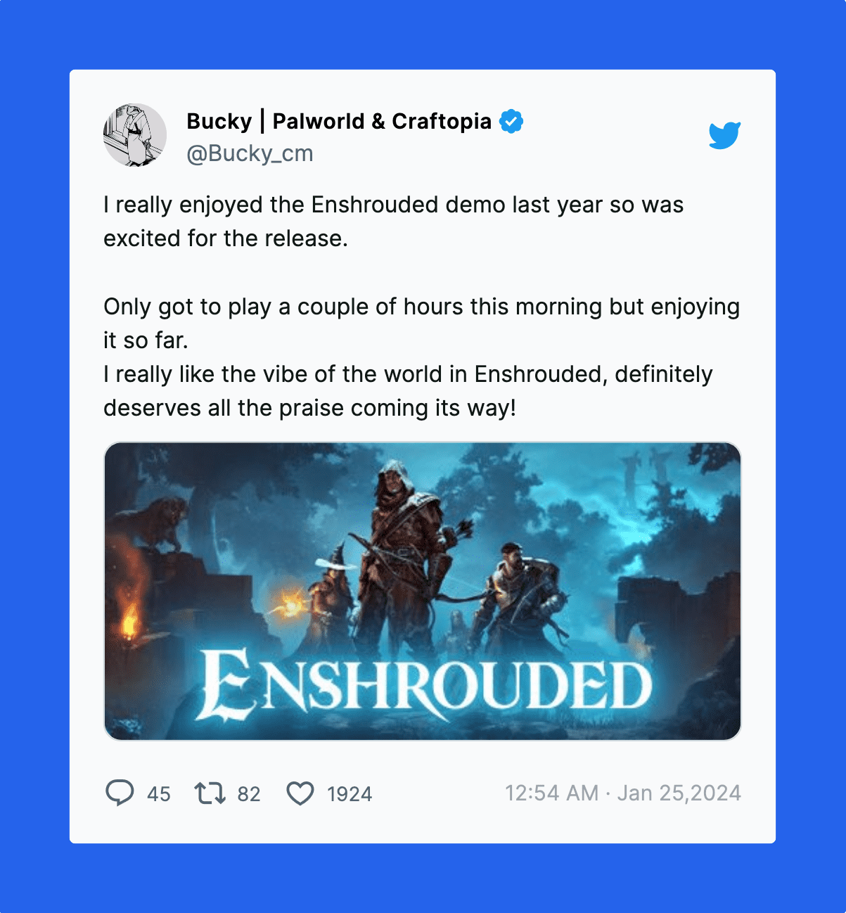 更难能可贵的是,帕鲁社区负责人 Bucky 还在推特上主动推荐了《雾锁王国》,看看人家这格局,爱了爱了♥️
