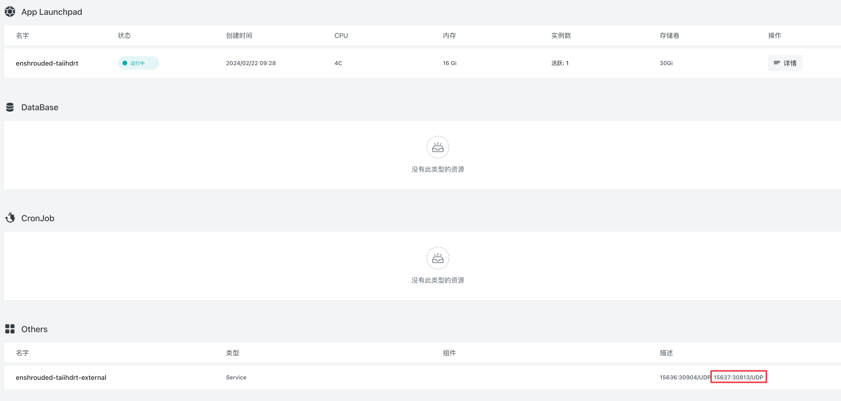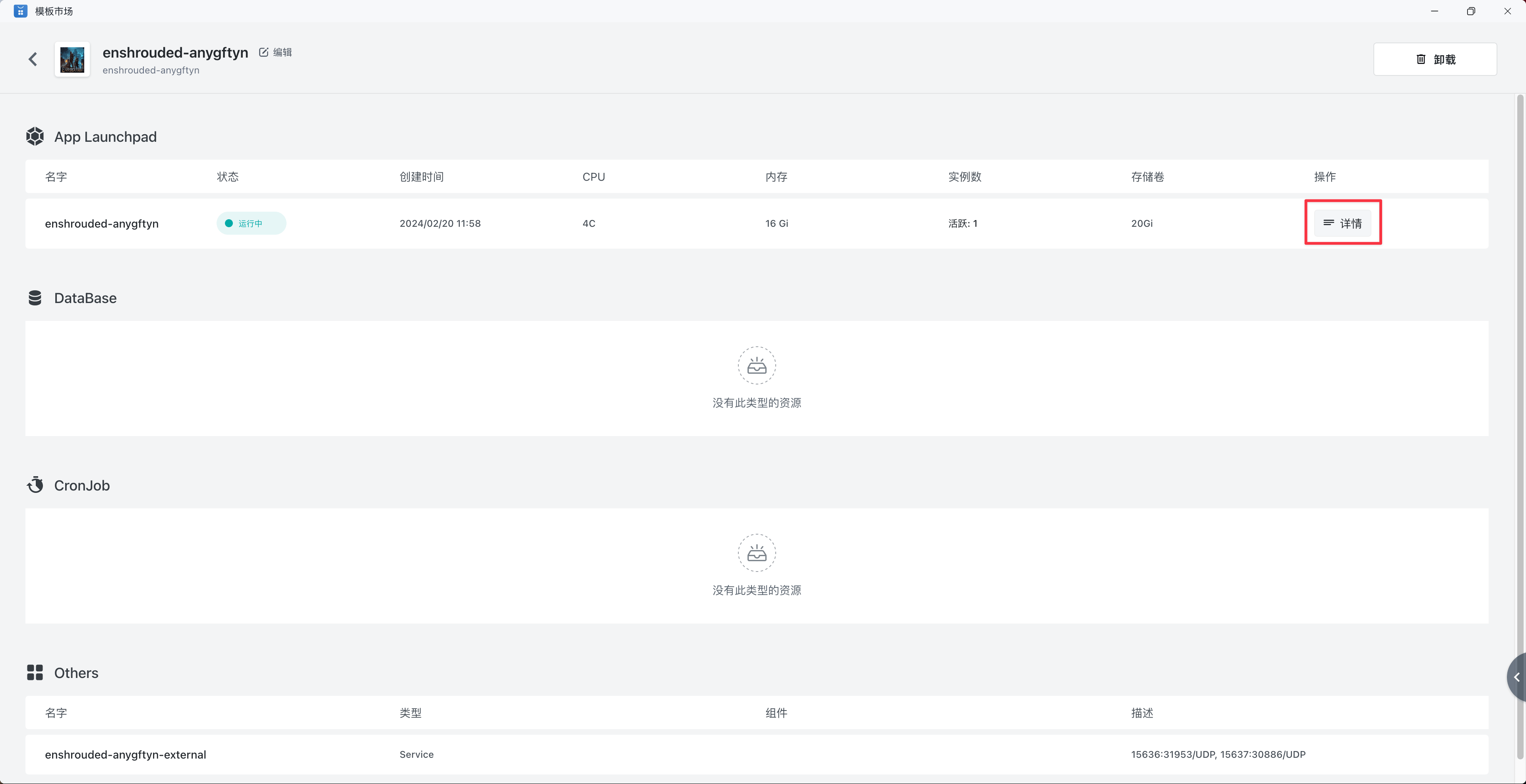 启动成功后,你可以关闭或者最小化「应用管理」App,然后回到「模板市场」的 palworld 应用界面,拉到最下面的「Others」,你会看到有一个类型叫「Service」的资源,它的描述部分有一个字段是这样写的:15637:30813/UDP,15367 后面的端口就是公网端口,比如这里的公网端口就是 30813。