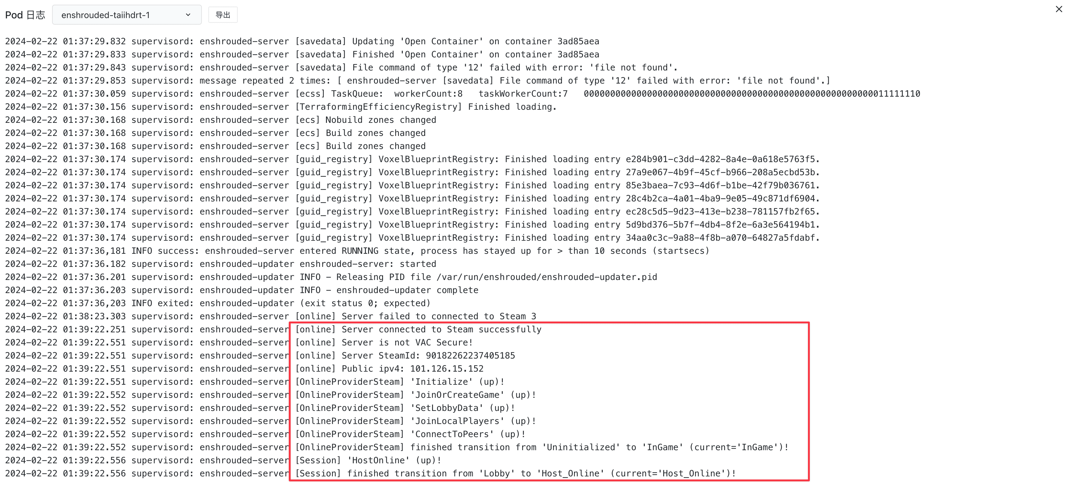 等待应用变成 Running 状态,然后点击日志按钮查看日志,只要出现了下面的日志,便是启动成功了: