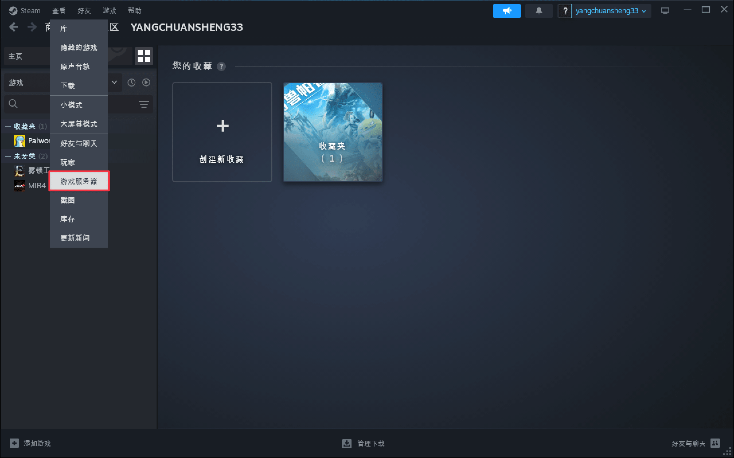 打开 Steam 登录账号,在 Steam 客户端内选择「查看」,再选择「游戏服务器」。