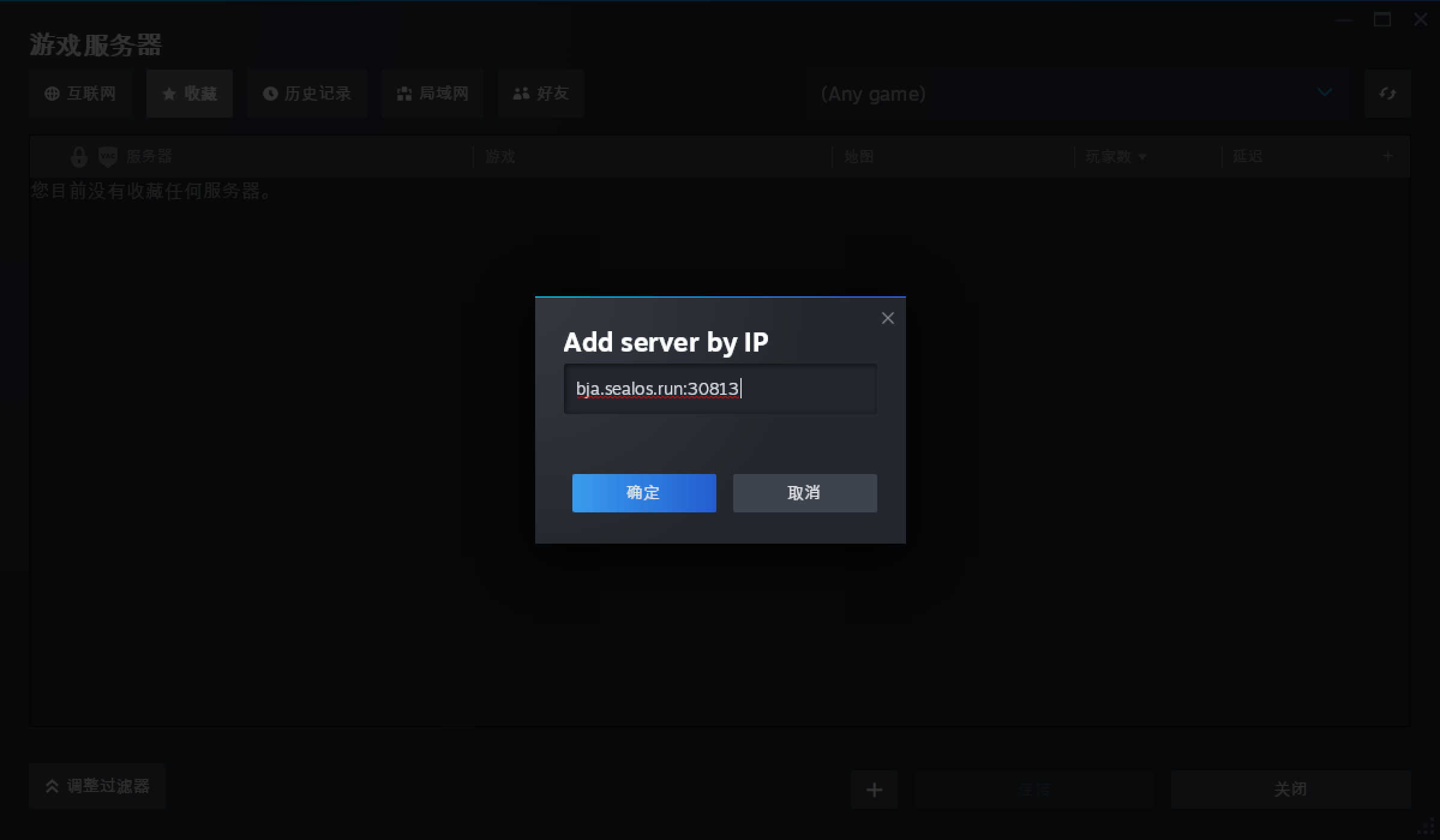在弹窗内输入雾锁王国私服的公网域名和端口(例如我上面部署的私服地址就是 bja.sealos.run:30813)。