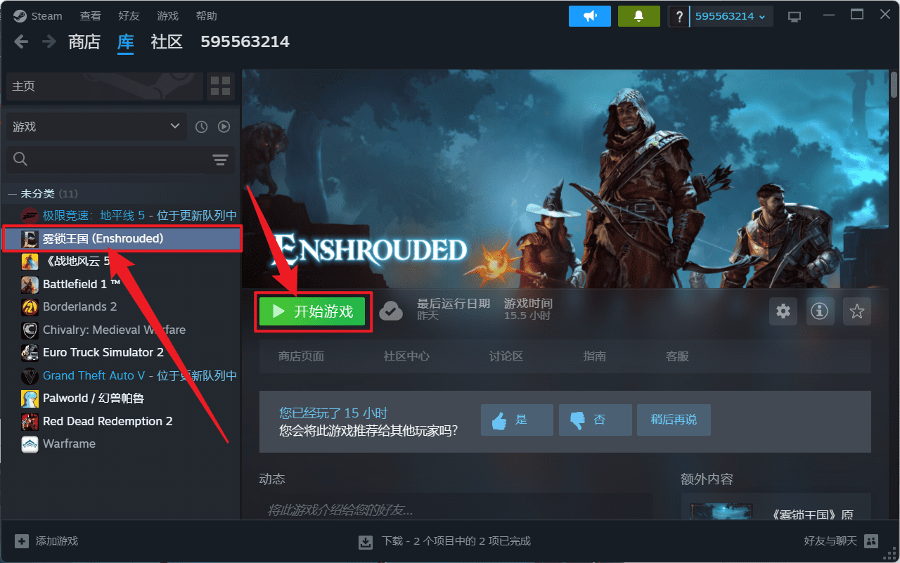 在「库」中找到雾锁王国(Enshrouded),点击「开始游戏」。