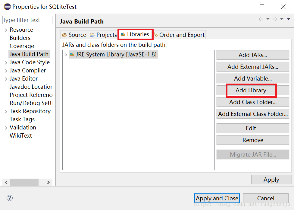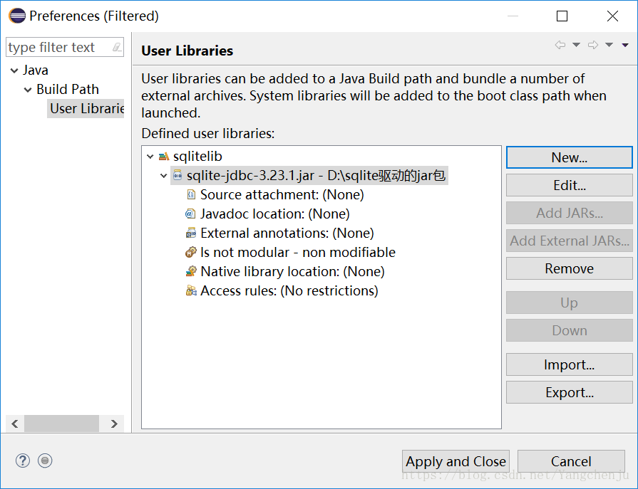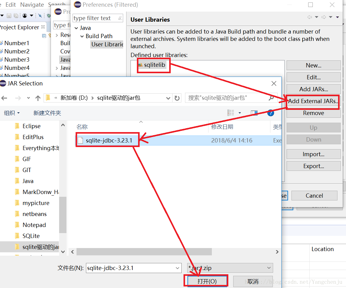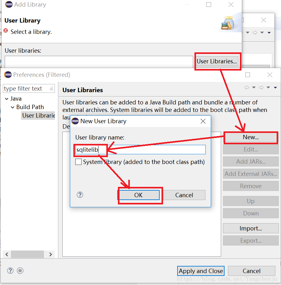 4.在新弹出的窗口中点击User Libraries…,这时会弹出另一个窗口,点击new…新建一个Libraries包,包名自己定义,我这里用的是sqlitelib,然后点确定继续下一步操作