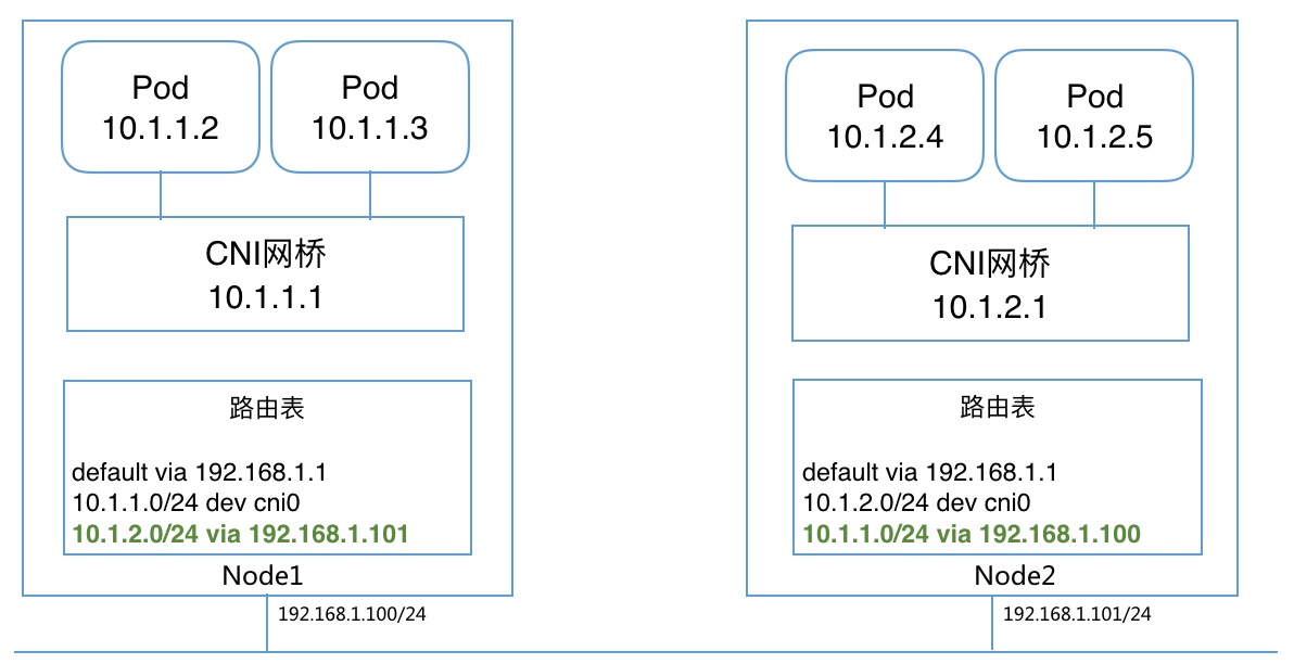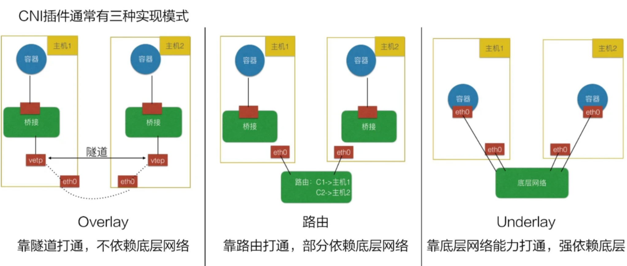 除了 Overlay 和 Underlay 模式外,CNI 网络插件的实现模式还包括一种路由模式。路由模式的主要特点是利用现有的物理网络设备和路由协议来实现容器之间的通信。